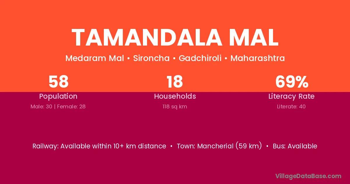 Mancherial (59 km) is the nearest town to Tamandala Mal village for major economic activities and is located approximately 59 km away.