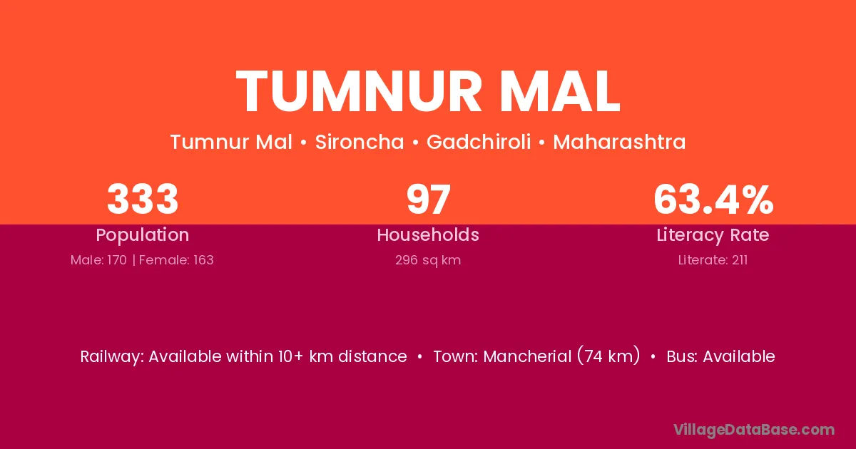 Mancherial (74 km) is the nearest town to Tumnur Mal village for major economic activities and is located approximately 74 km away.