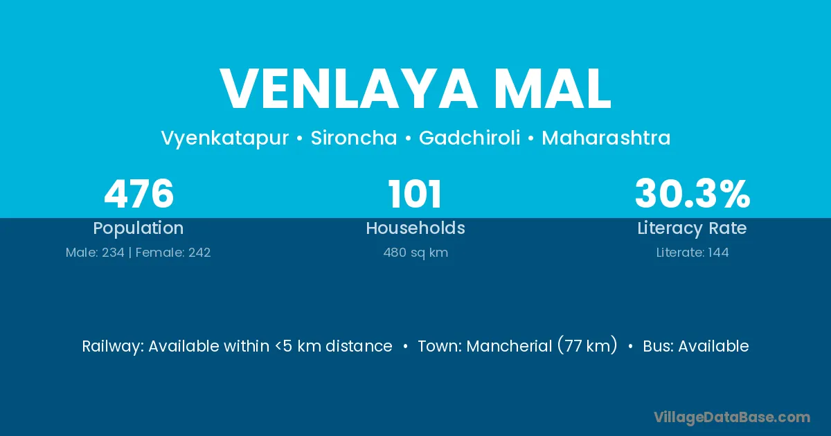 Mancherial (77 km) is the nearest town to Venlaya Mal village for major economic activities and is located approximately 77 km away.