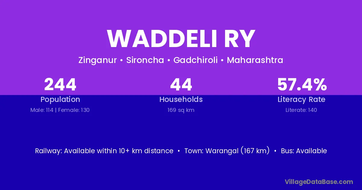 Warangal (167 km) is the nearest town to Waddeli Ry village for major economic activities and is located approximately 167 km away.