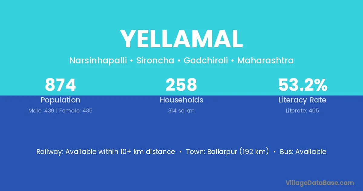 Ballarpur (192 km) is the nearest town to Yellamal village for major economic activities and is located approximately 192 km away.