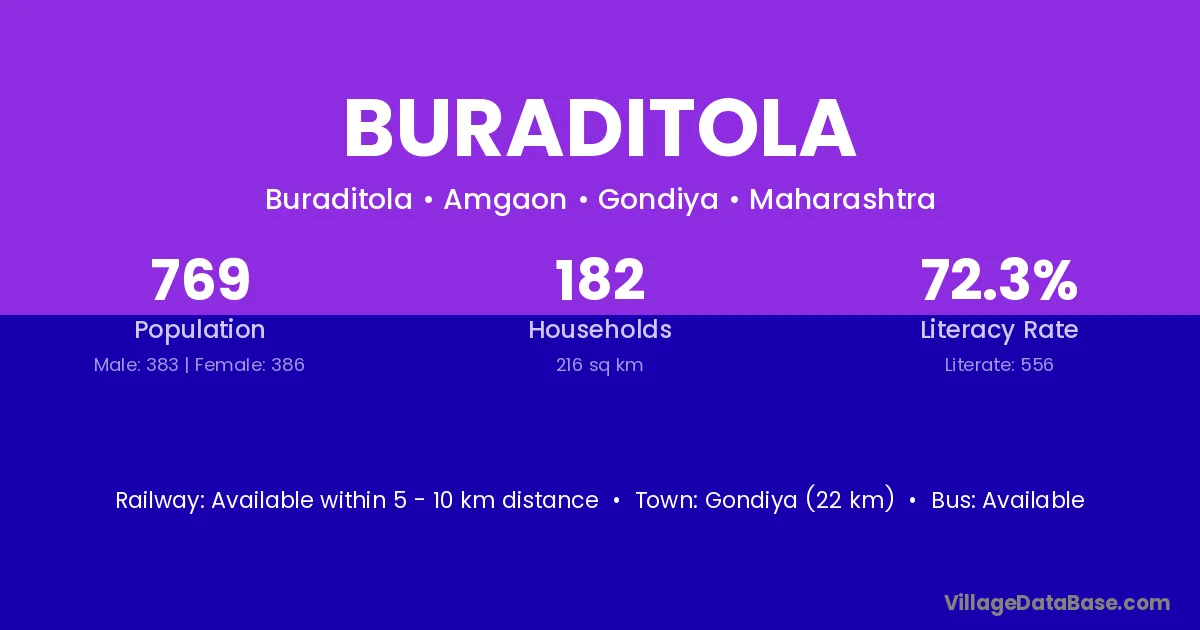 Gondiya (22 km) is the nearest town to Buraditola village for major economic activities and is located approximately 22 km away.
