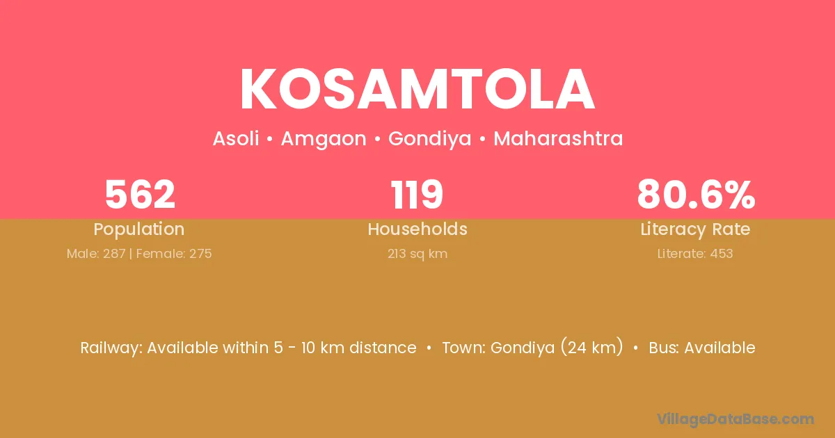 Gondiya (24 km) is the nearest town to Kosamtola village for major economic activities and is located approximately 24 km away.