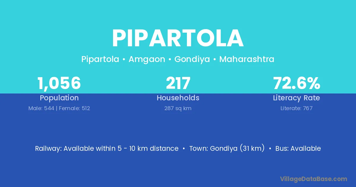 Gondiya (31 km) is the nearest town to Pipartola village for major economic activities and is located approximately 31 km away.