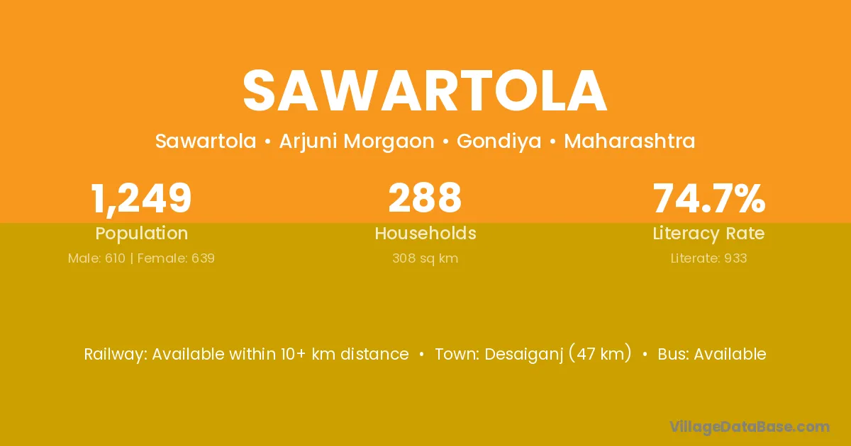 Sawartola village has a total population of 1,249 people, of which 610 are males and 639 are females.