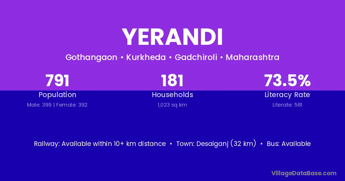 Desaiganj (49 km) is the nearest town to Yerandi village for major economic activities and is located approximately 49 km away.