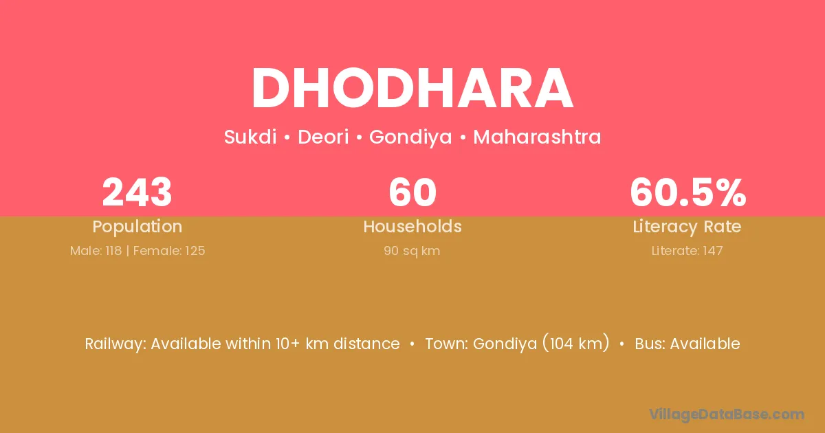 Gondiya (104 km) is the nearest town to Dhodhara village for major economic activities and is located approximately 104 km away.