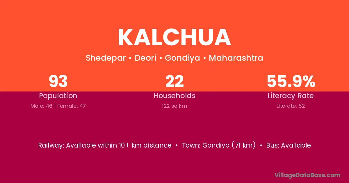 Kalchua village has a total population of 93 people, of which 46 are males and 47 are females.