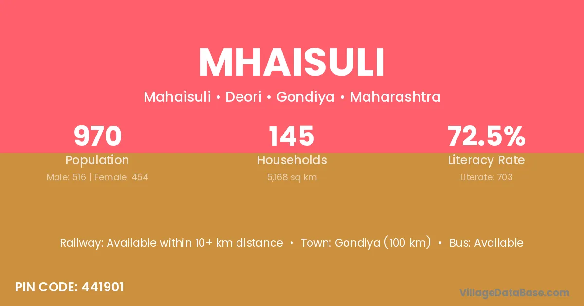Mhaisuli village has a total population of 970 people, of which 516 are males and 454 are females.