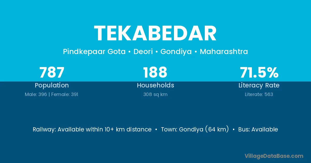 Gondiya (64 km) is the nearest town to Tekabedar village for major economic activities and is located approximately 64 km away.