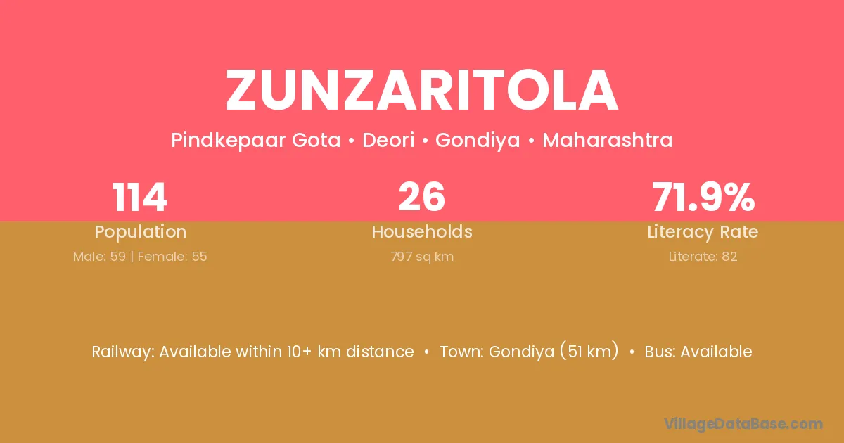 Gondiya (51 km) is the nearest town to Zunzaritola village for major economic activities and is located approximately 51 km away.
