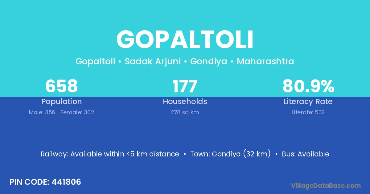 Gondiya (32 km) is the nearest town to Gopaltoli village for major economic activities and is located approximately 32 km away.