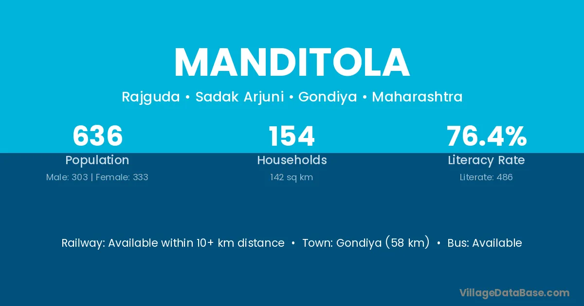 Gondiya (58 km) is the nearest town to Manditola village for major economic activities and is located approximately 58 km away.