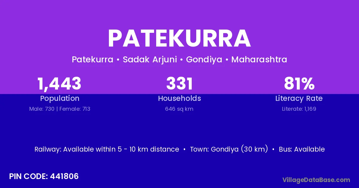 Gondiya (30 km) is the nearest town to Patekurra village for major economic activities and is located approximately 30 km away.
