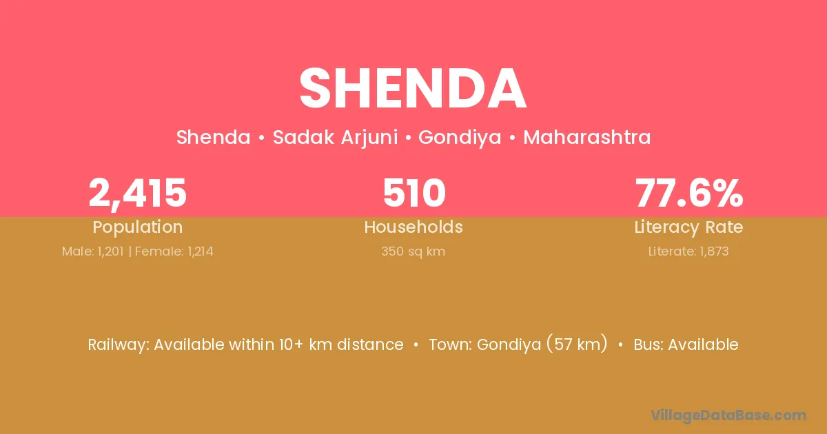 Gondiya (57 km) is the nearest town to Shenda village for major economic activities and is located approximately 57 km away.