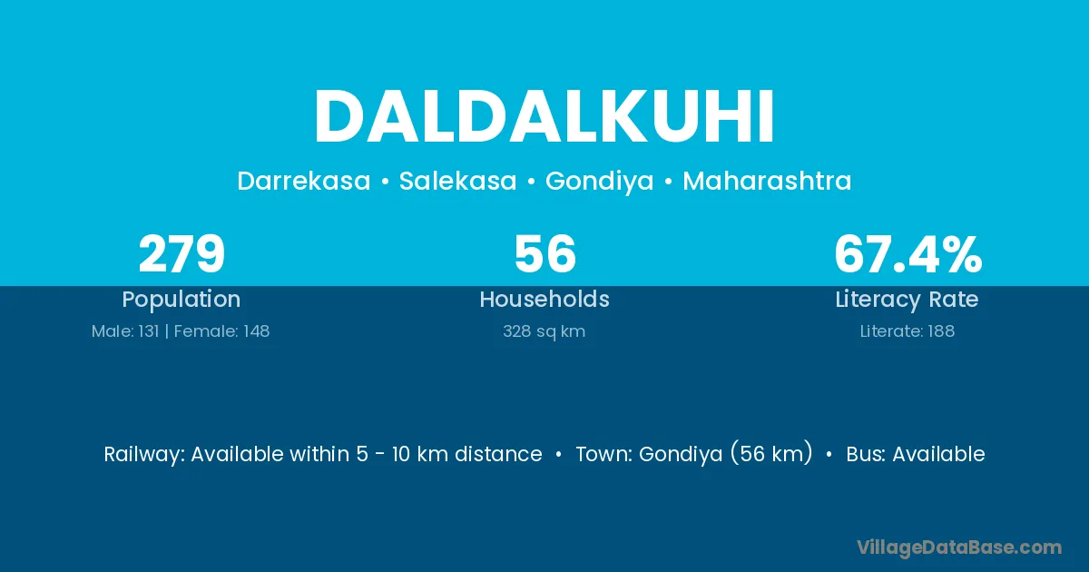 Gondiya (56 km) is the nearest town to Daldalkuhi village for major economic activities and is located approximately 56 km away.