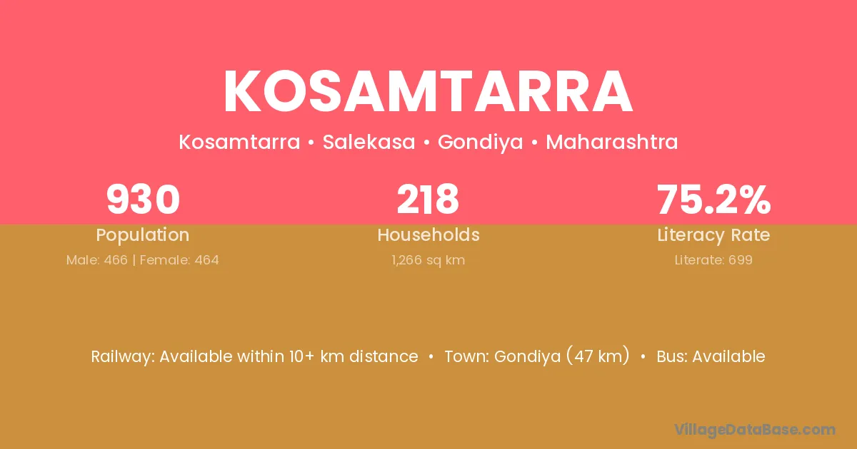 Gondiya (47 km) is the nearest town to Kosamtarra village for major economic activities and is located approximately 47 km away.