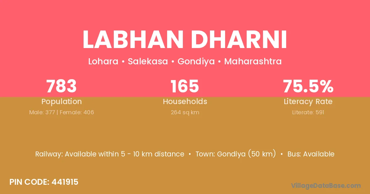 Gondiya (50 km) is the nearest town to Labhan Dharni village for major economic activities and is located approximately 50 km away.