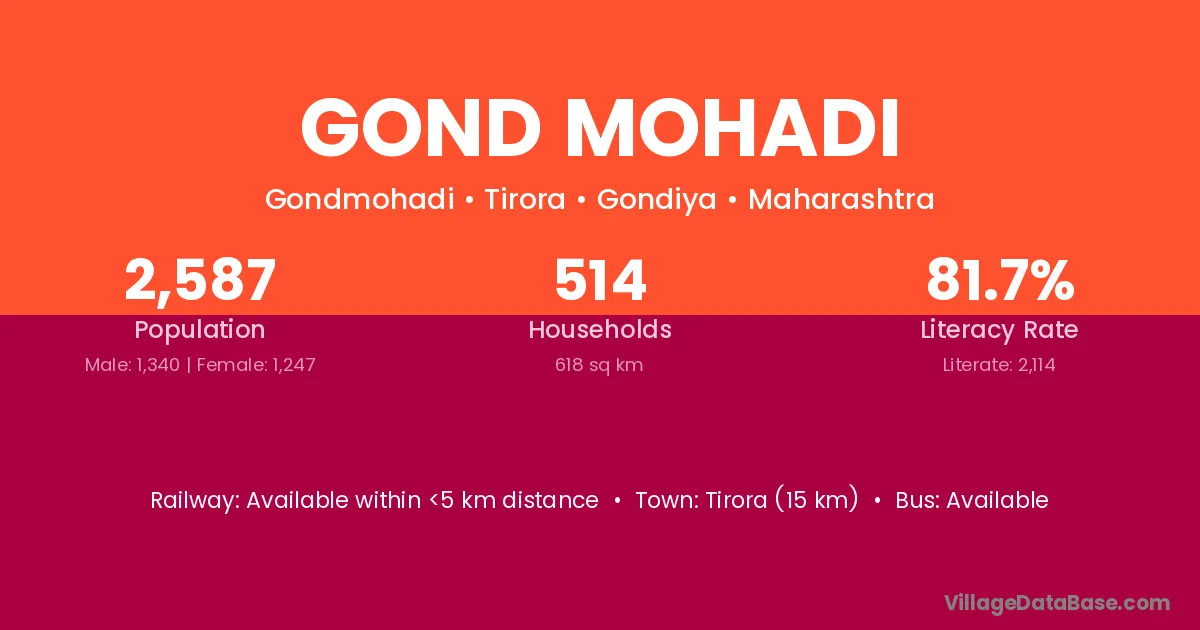 Tirora (15 km) is the nearest town to Gond Mohadi village for major economic activities and is located approximately 15 km away.