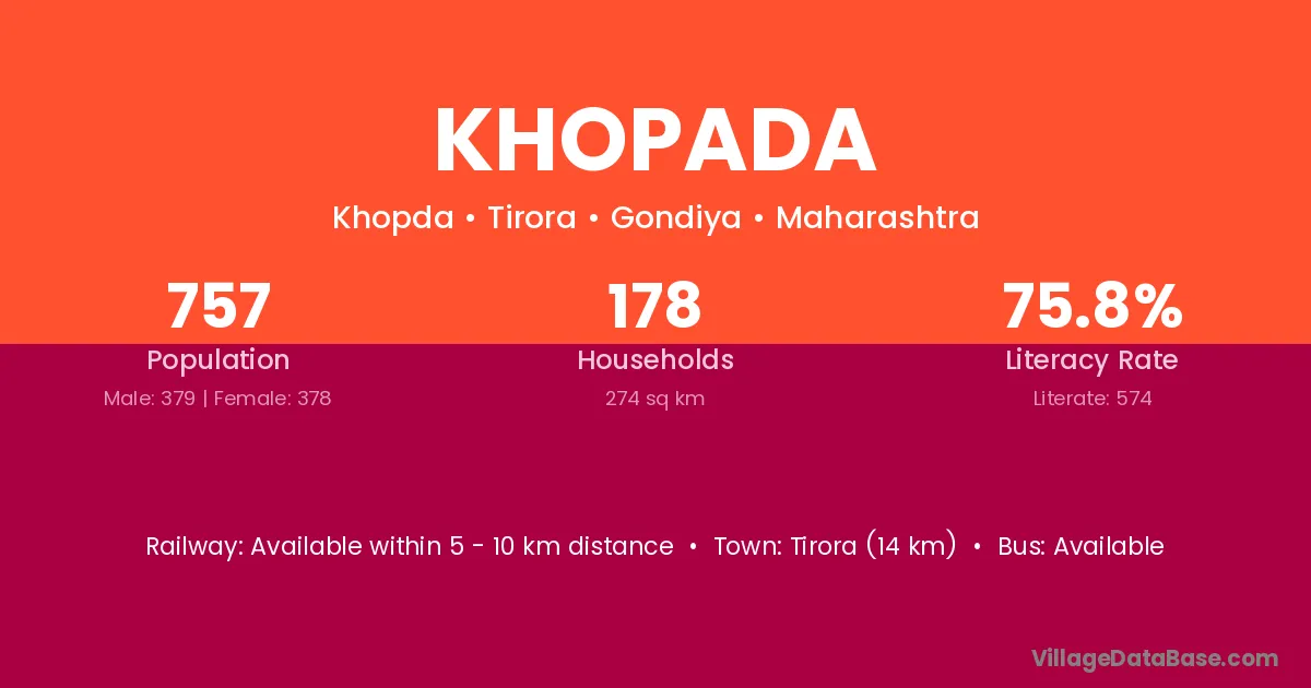 Tirora (14 km) is the nearest town to Khopada village for major economic activities and is located approximately 14 km away.