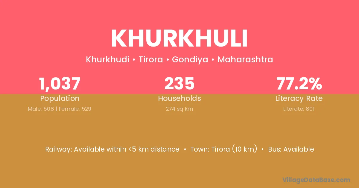 Tirora (10 km) is the nearest town to Khurkhuli village for major economic activities and is located approximately 10 km away.