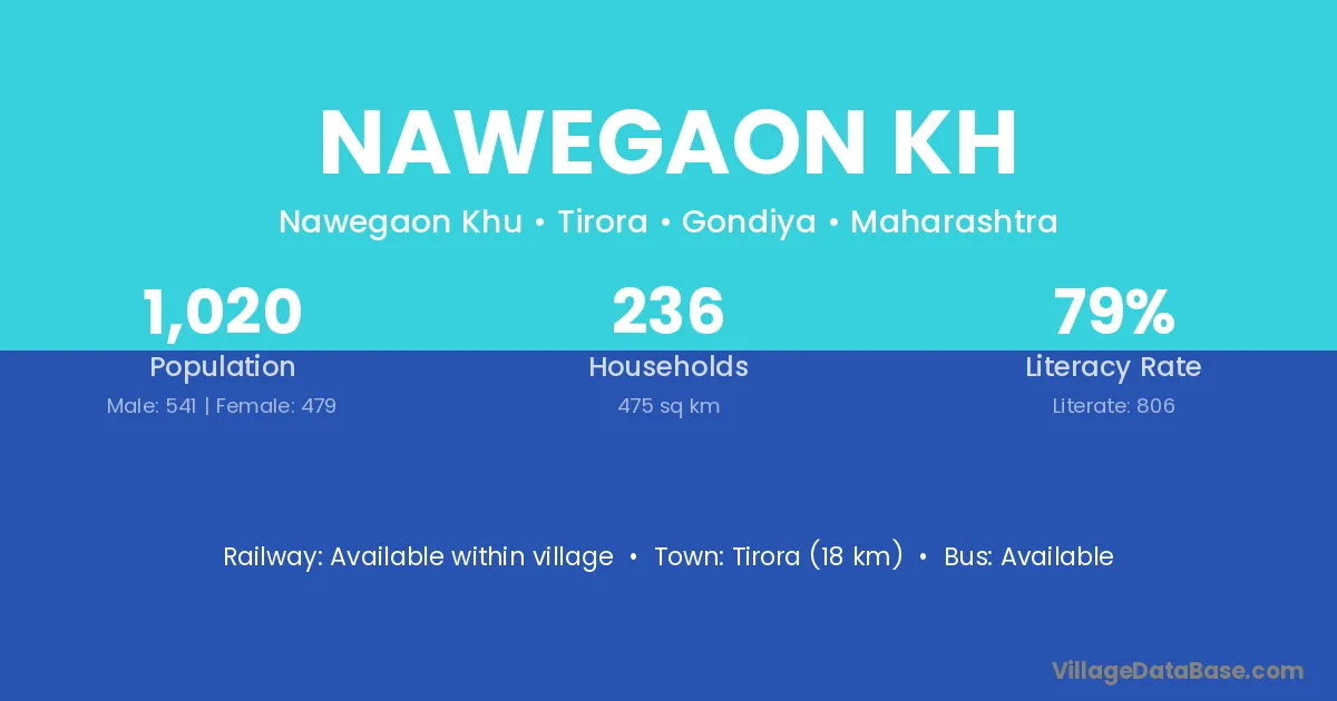 Tirora (18 km) is the nearest town to Nawegaon Kh village for major economic activities and is located approximately 18 km away.