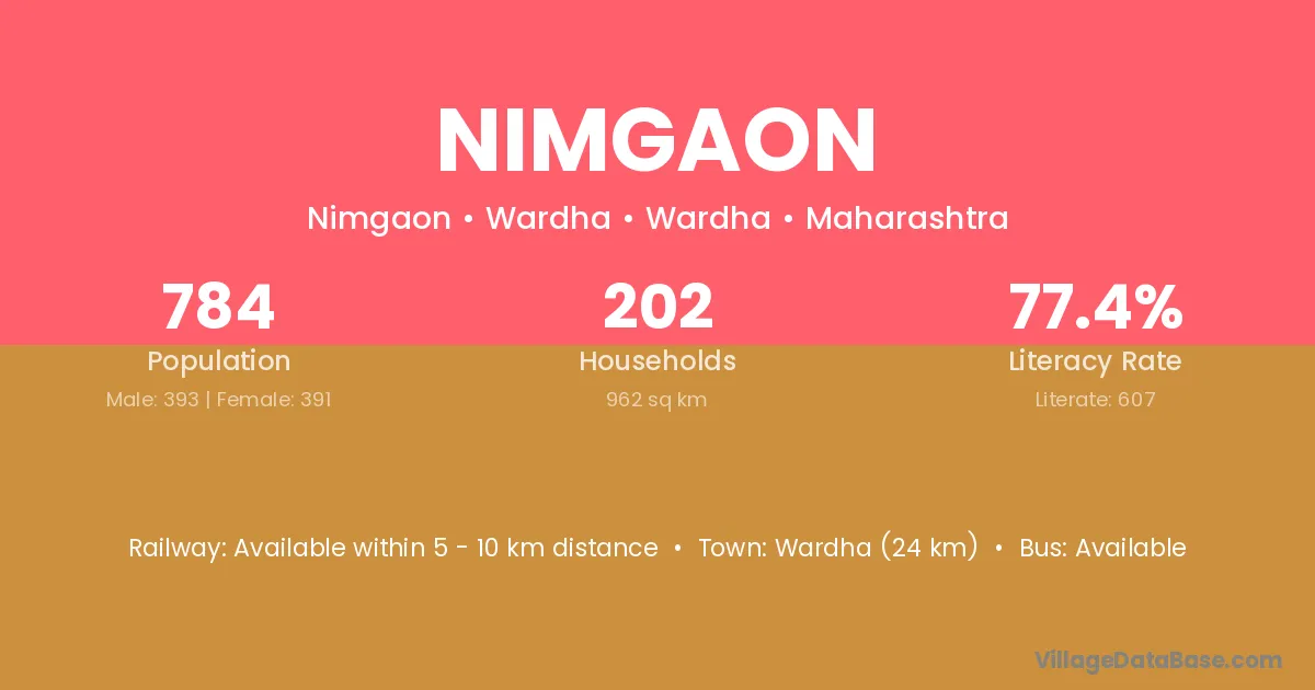Tirora (9 km) is the nearest town to Nimgaon village for major economic activities and is located approximately 9 km away.