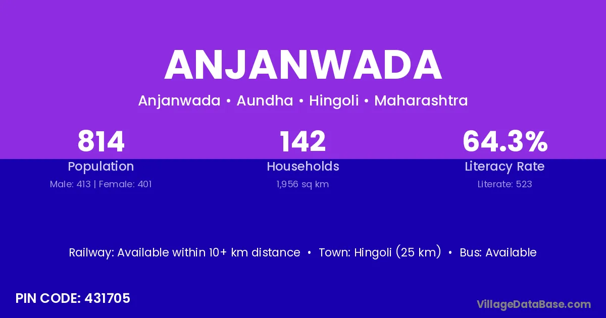 Hingoli (25 km) is the nearest town to Anjanwada village for major economic activities and is located approximately 25 km away.
