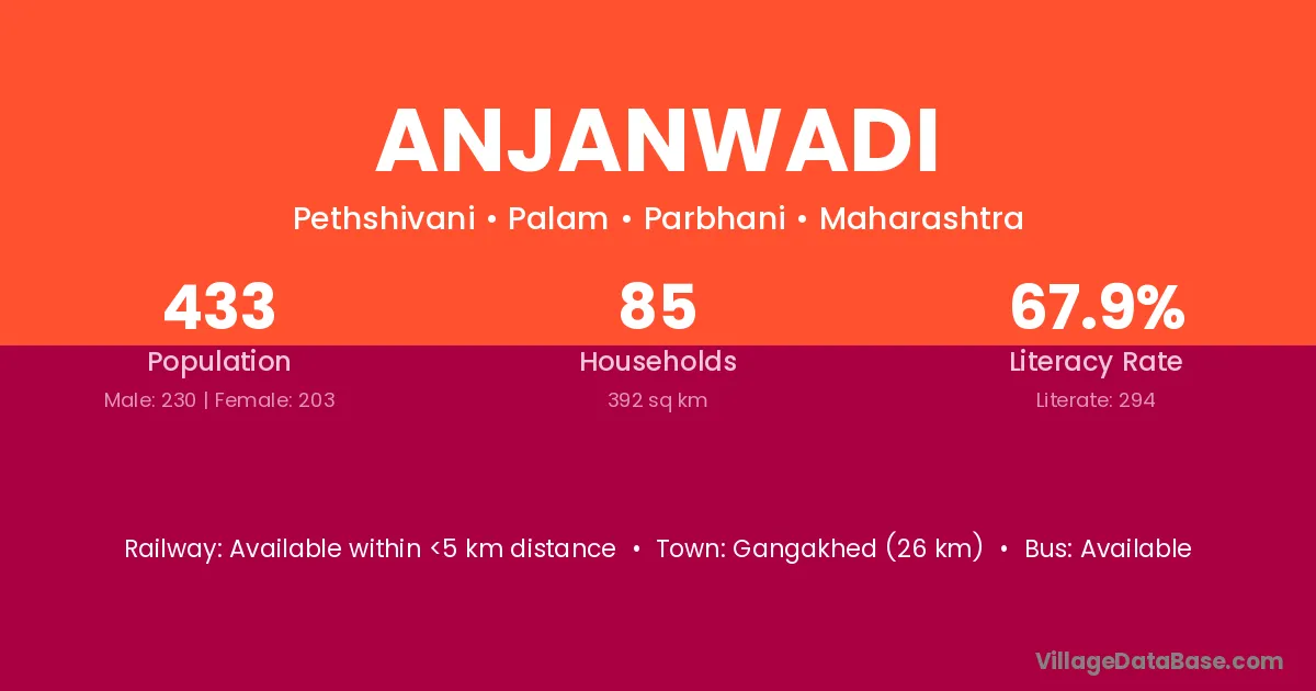Basmath (48 km) is the nearest town to Anjanwadi village for major economic activities and is located approximately 48 km away.