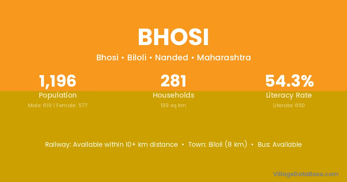 Hingoli (25 km) is the nearest town to Bhosi village for major economic activities and is located approximately 25 km away.