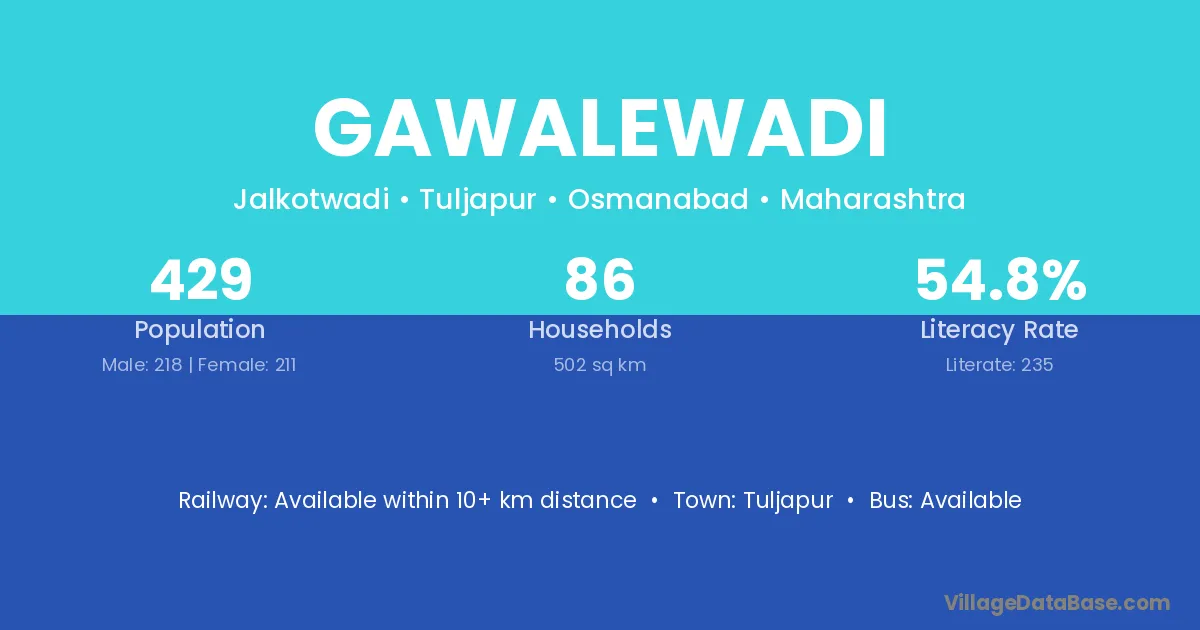 Gawalewadi village has a total population of 829 people, of which 429 are males and 400 are females.