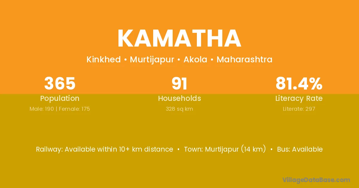 The literacy rate of Kamatha village is 53.47%. Male literacy stands at 62.07% and female literacy at 41.86%.