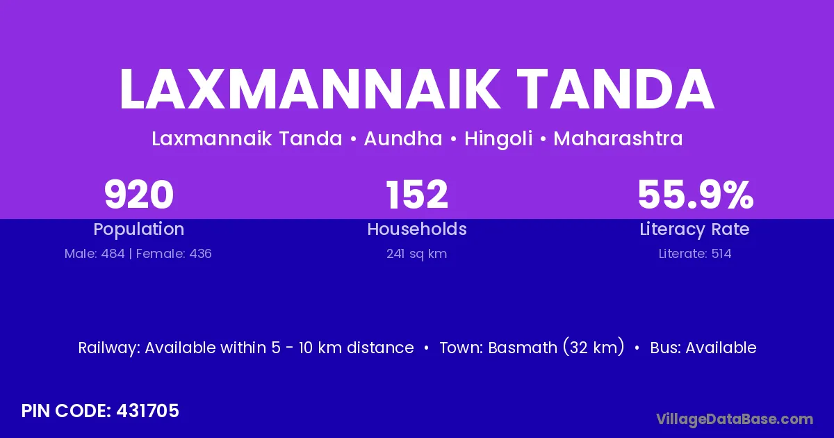 Basmath (32 km) is the nearest town to Laxmannaik Tanda village for major economic activities and is located approximately 32 km away.