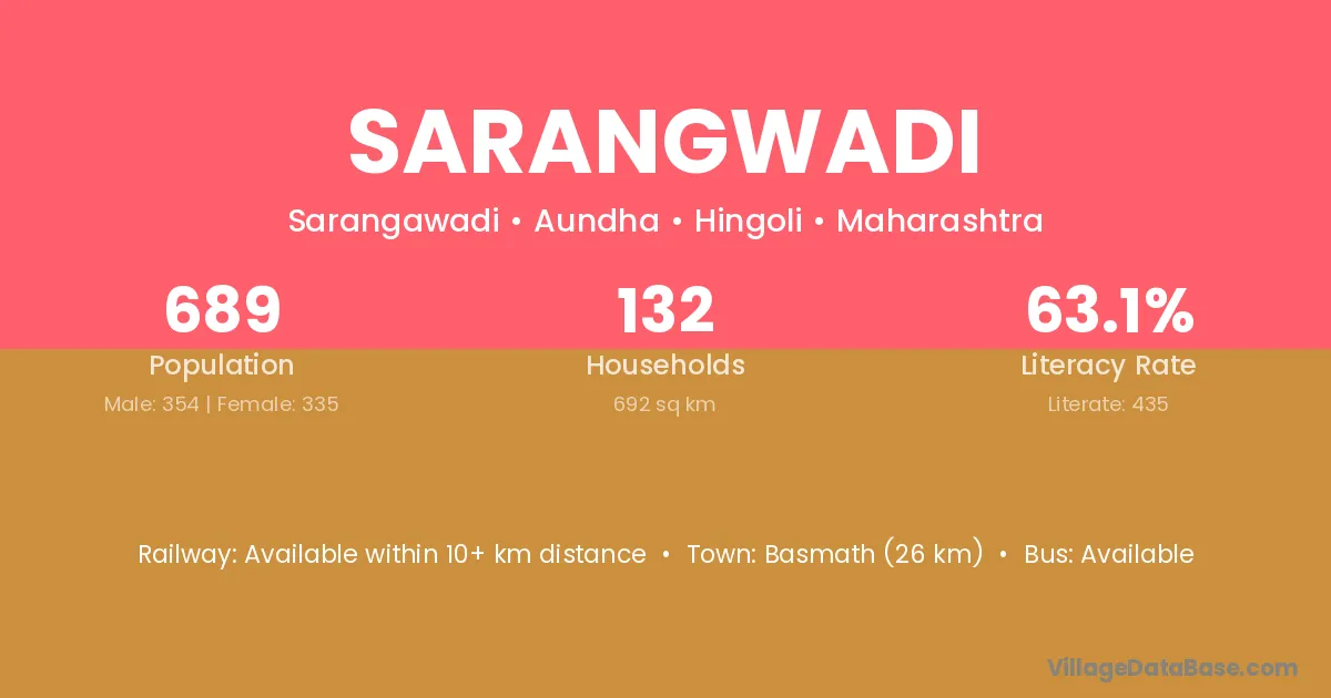 Sarangwadi village has a total population of 689 people, of which 354 are males and 335 are females.