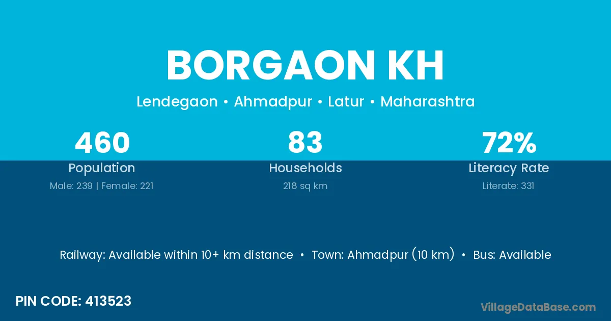 Borgaon Kh village has a total population of 421 people, of which 229 are males and 192 are females.