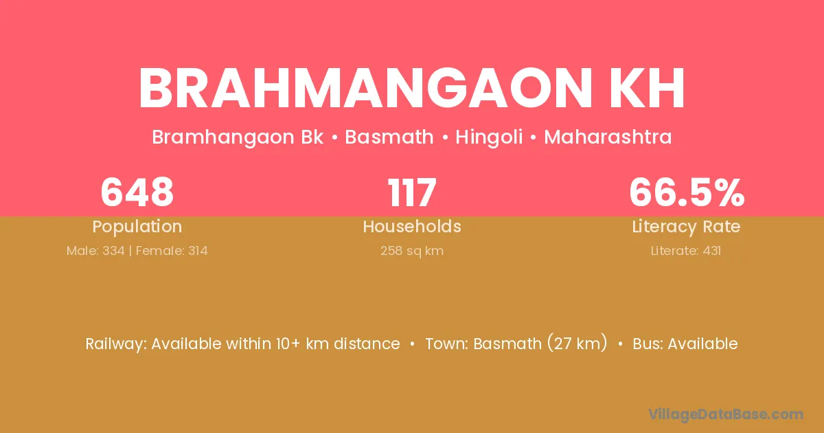 Basmath (27 km) is the nearest town to Brahmangaon Kh village for major economic activities and is located approximately 27 km away.
