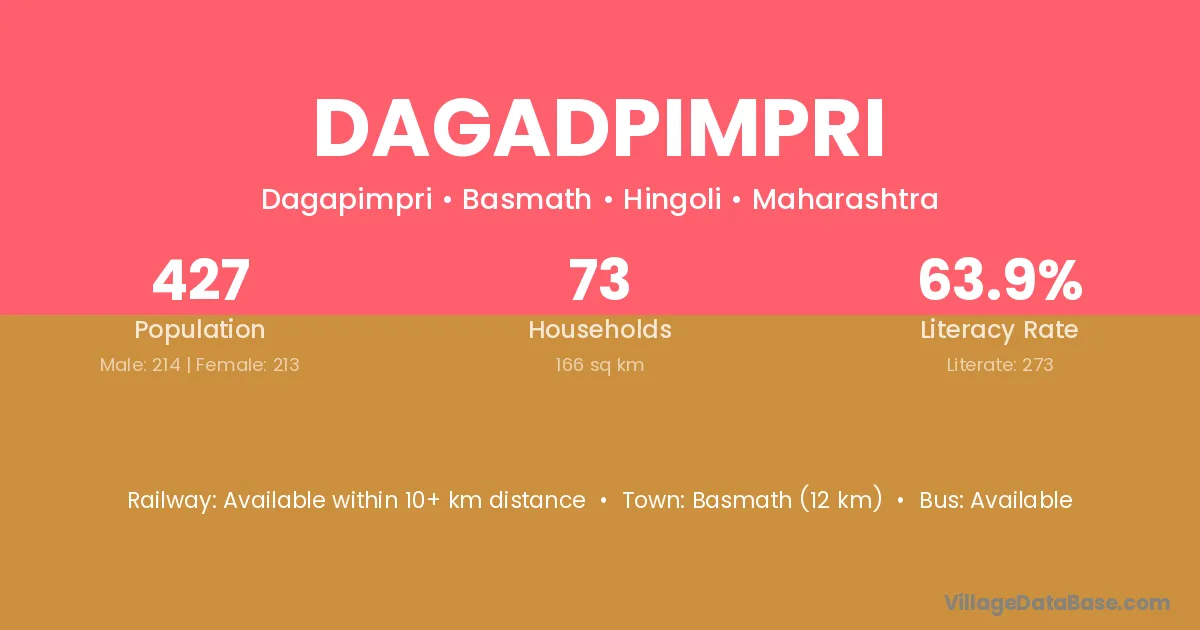 Basmath (12 km) is the nearest town to Dagadpimpri village for major economic activities and is located approximately 12 km away.