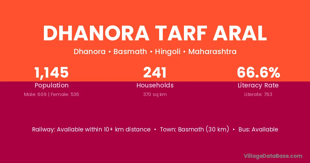 Basmath (30 km) is the nearest town to Dhanora Tarf Aral village for major economic activities and is located approximately 30 km away.