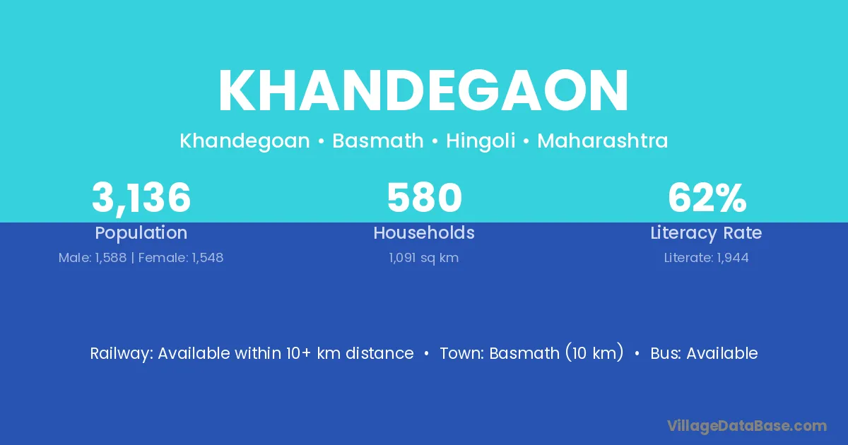 Basmath (10 km) is the nearest town to Khandegaon village for major economic activities and is located approximately 10 km away.