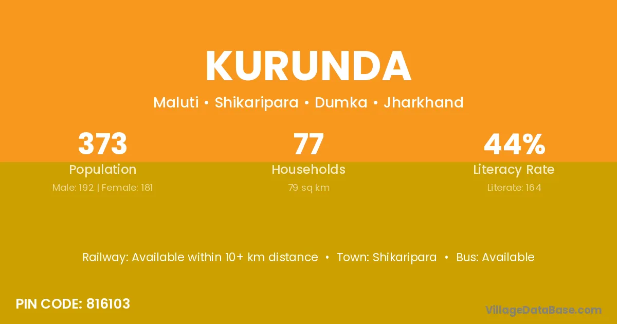Kurunda village has a total population of 12,323 people, of which 6,308 are males and 6,015 are females.