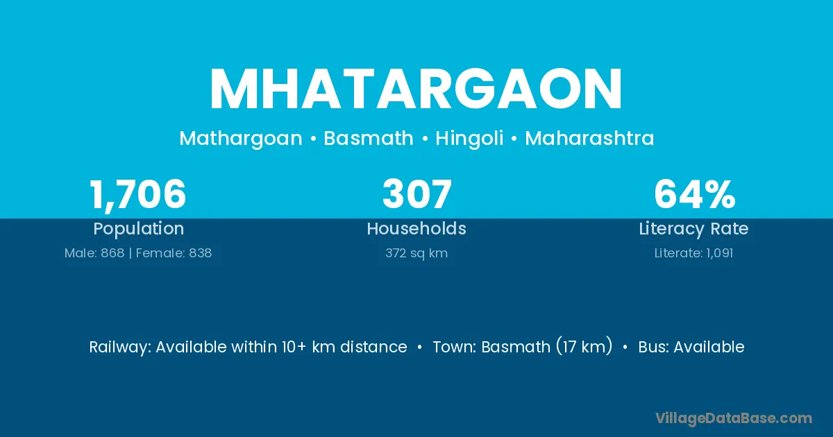 Basmath (17 km) is the nearest town to Mhatargaon village for major economic activities and is located approximately 17 km away.