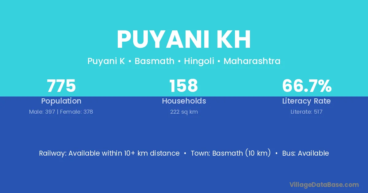 Puyani Kh village has a total population of 775 people, of which 397 are males and 378 are females.