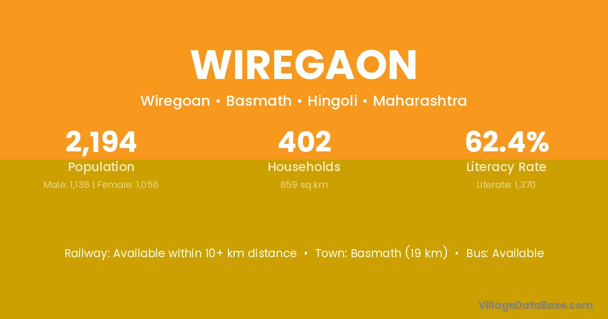 Basmath (19 km) is the nearest town to Wiregaon village for major economic activities and is located approximately 19 km away.