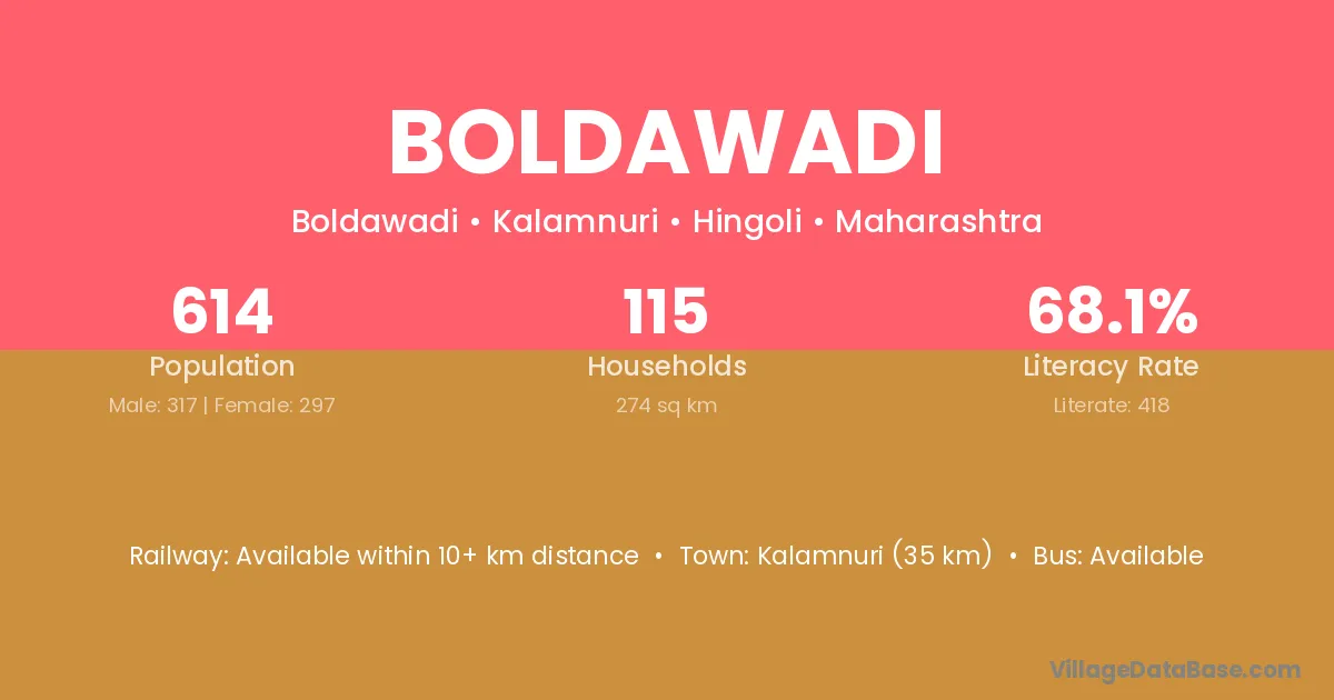Kalamnuri (35 km) is the nearest town to Boldawadi village for major economic activities and is located approximately 35 km away.