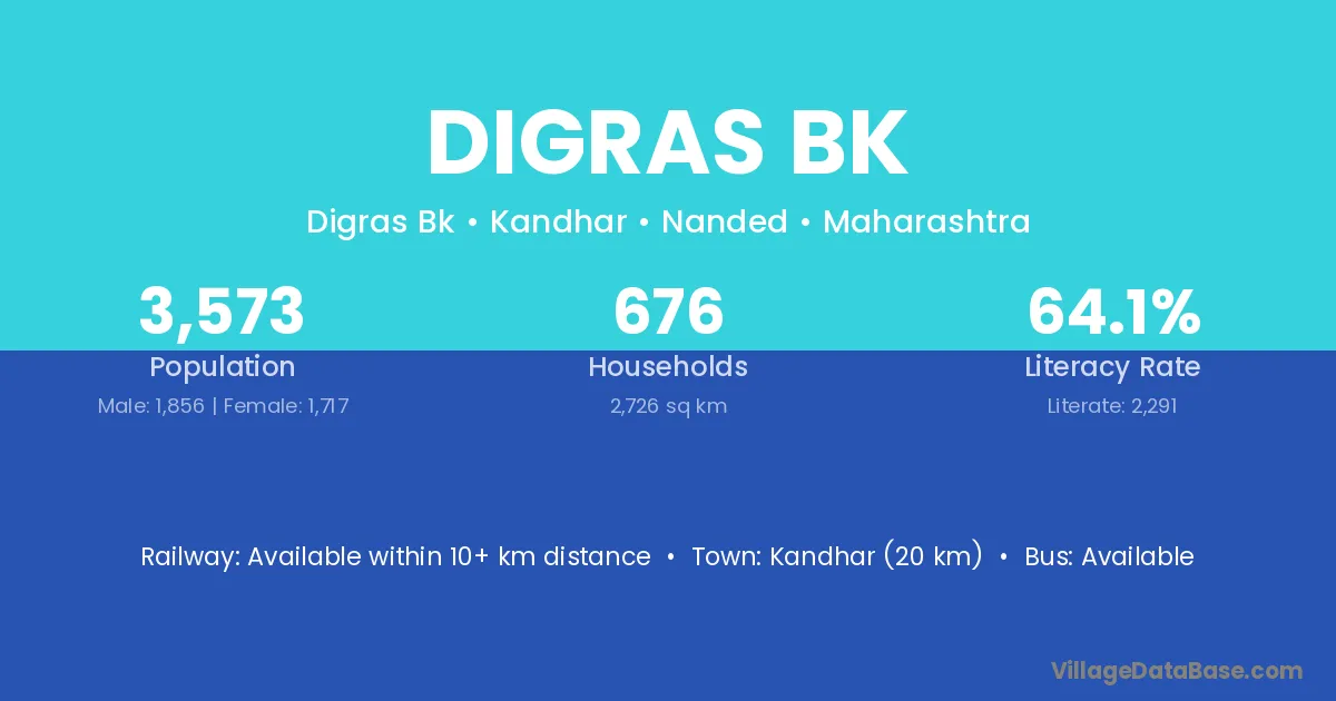 Nanded (35 km) is the nearest town to Digras Bk village for major economic activities and is located approximately 35 km away.