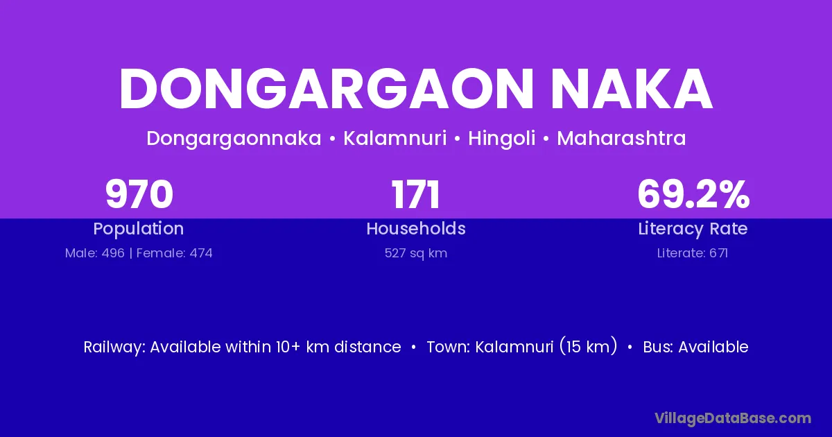 Kalamnuri (15 km) is the nearest town to Dongargaon Naka village for major economic activities and is located approximately 15 km away.