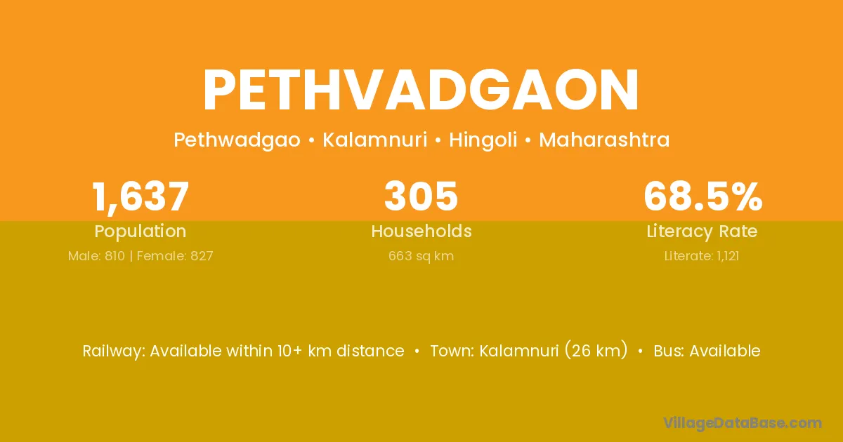 Kalamnuri (26 km) is the nearest town to Pethvadgaon village for major economic activities and is located approximately 26 km away.
