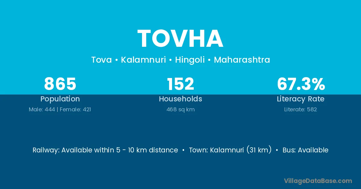 Kalamnuri (31 km) is the nearest town to Tovha village for major economic activities and is located approximately 31 km away.