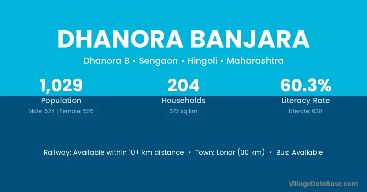 Lonar (30 km) is the nearest town to Dhanora Banjara village for major economic activities and is located approximately 30 km away.