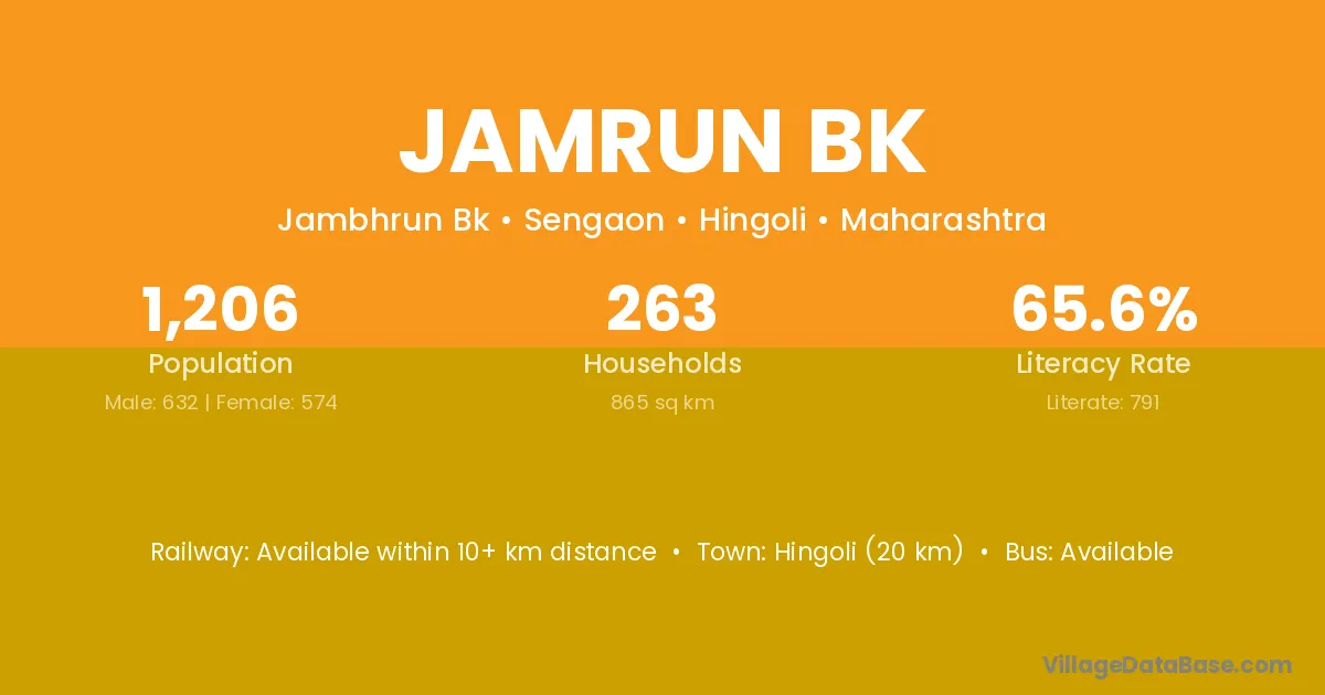 Hingoli (20 km) is the nearest town to Jamrun Bk village for major economic activities and is located approximately 20 km away.